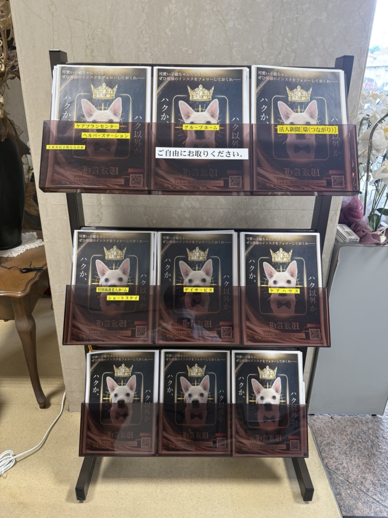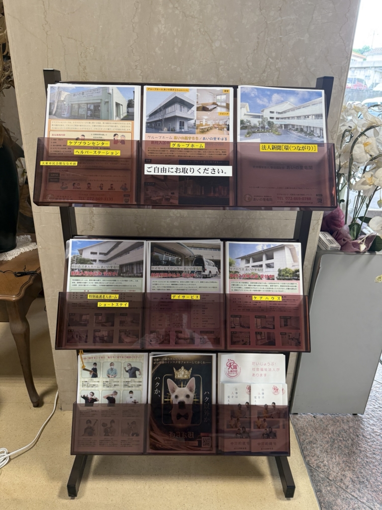 本館ロビー玄関の横に、施設のパンフレット一覧が設置されています。