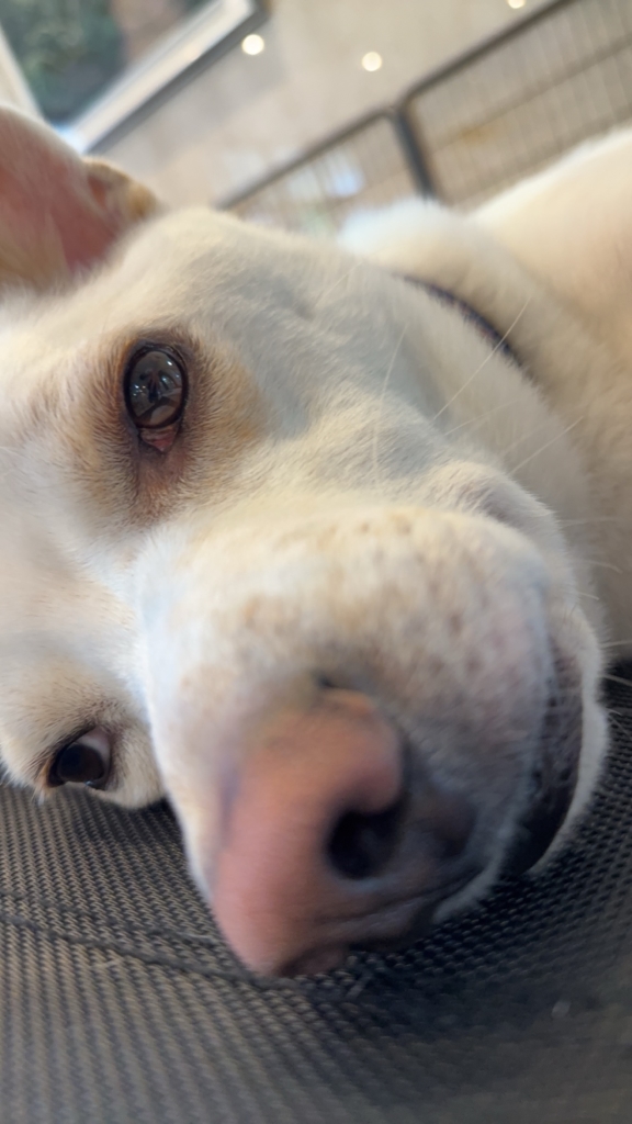 なんて目立ちたがりな犬だ!と顔を覗き込むとこの表情。してやったり、といった感じですね。