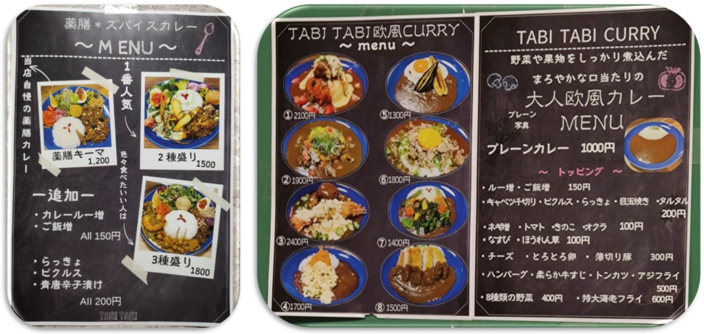 お店おすすめは一日10食限定の薬膳スパイスカレーとのこと。辛さが調節できる欧風カレーもあるそうでして、写真を見るとトッピングがとても美味しそうです。左上のハンバーグカレー?、気になります(*’ω’*)