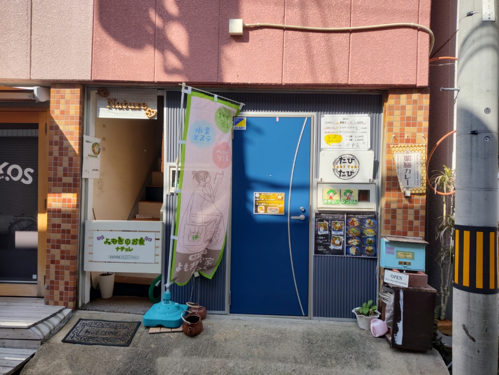 なにやら青い扉が見えますが…よもぎ蒸し?いや、よもぎ蒸しは2階っぽい。壁をよく見ると「薬膳カレー」の文字が。つまり、カレー屋発見!営業時間も14時までなのでセーフ。しかし、店の中が見えなくて本当にやっているかわからない…(汗)