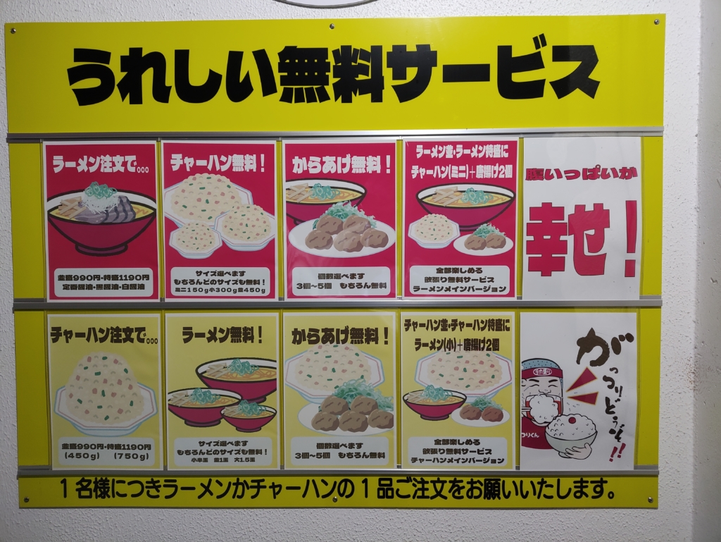 無料サービスは「チャーハン(ミニ:150g~並:450g)」「からあげ(3~5個)」「チャーハンミニ+からあげ2個」の3パターンから選べます。チャーハンを注文した場合はラーメン無料サービスになります。(半玉~1.5玉)