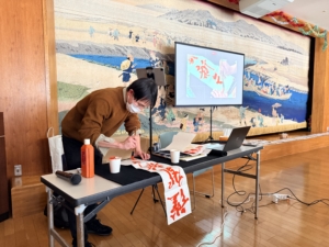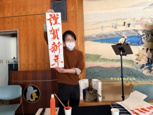 今回の書き初めレクは初の試みとして、日展に入賞経験のある書道家であり、私の友人でもある山辺航平先生に講師をお願いしました。