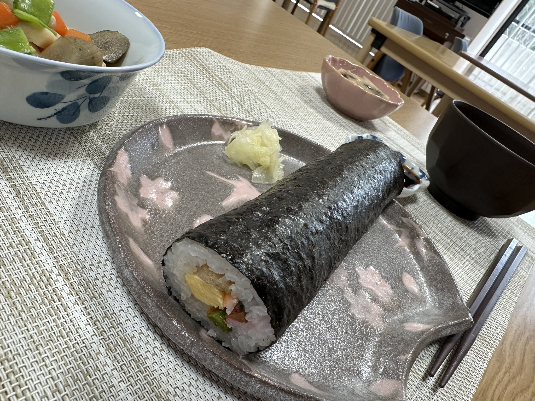 入居者様の巻き寿司は短めに切ったり、玉子で巻いたり、食べやすいように配慮しています。