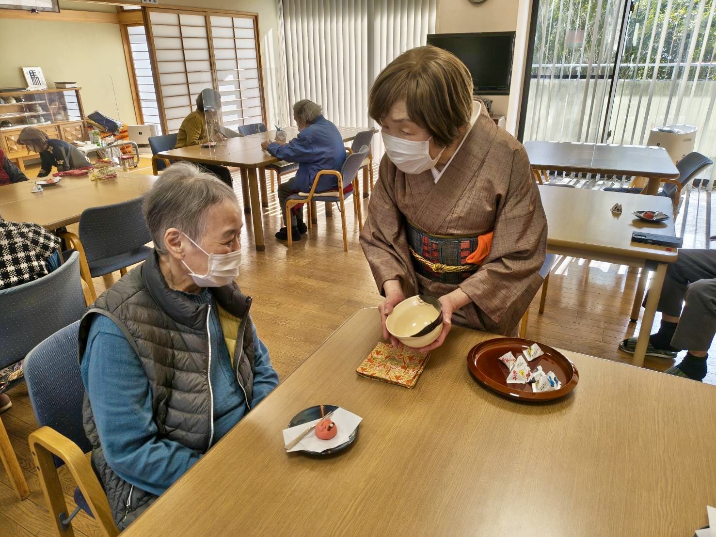まずは椅子に座ったままできる体操をしてから、お茶の先生に点てていただいたお抹茶をいただきました。