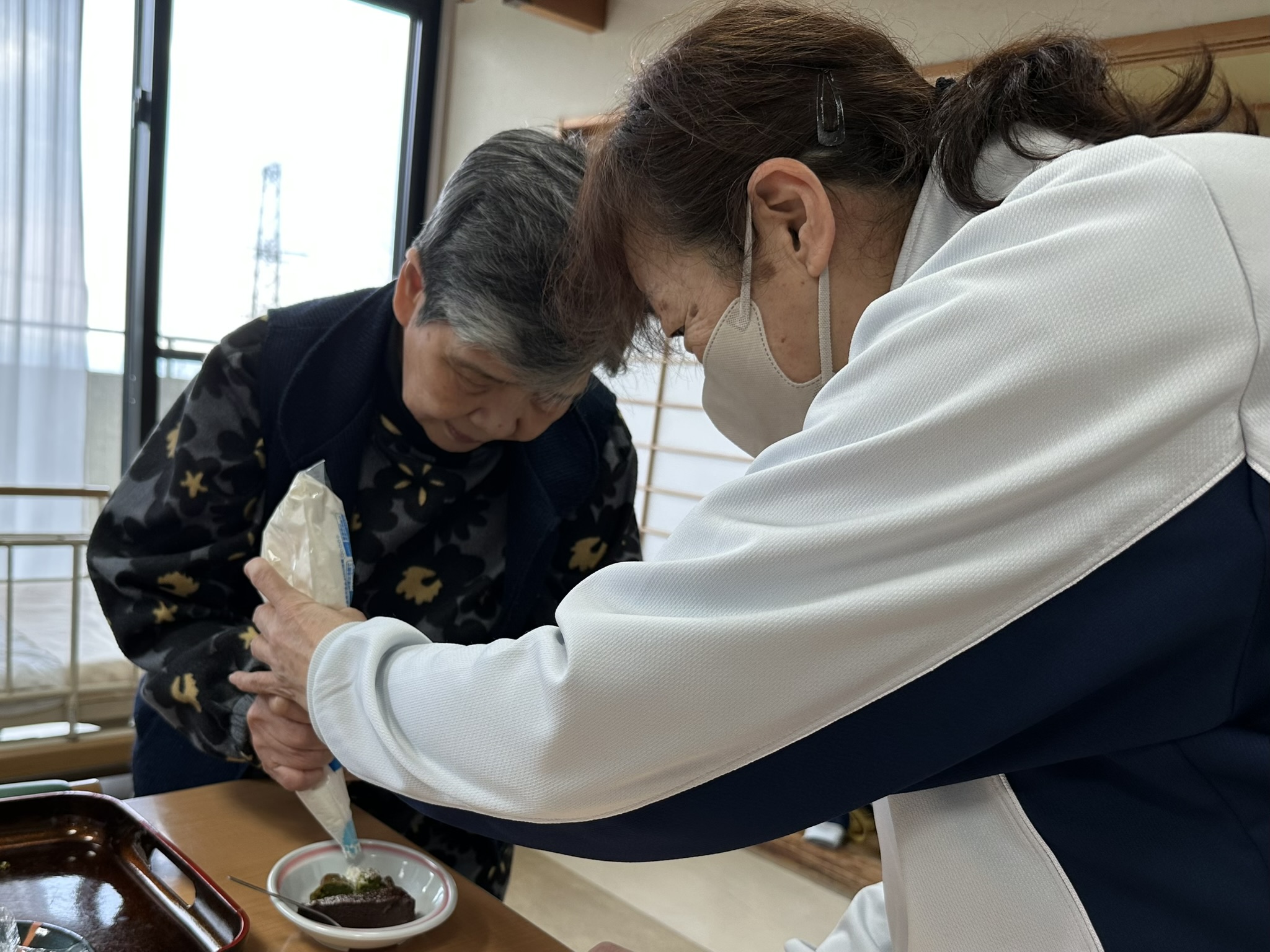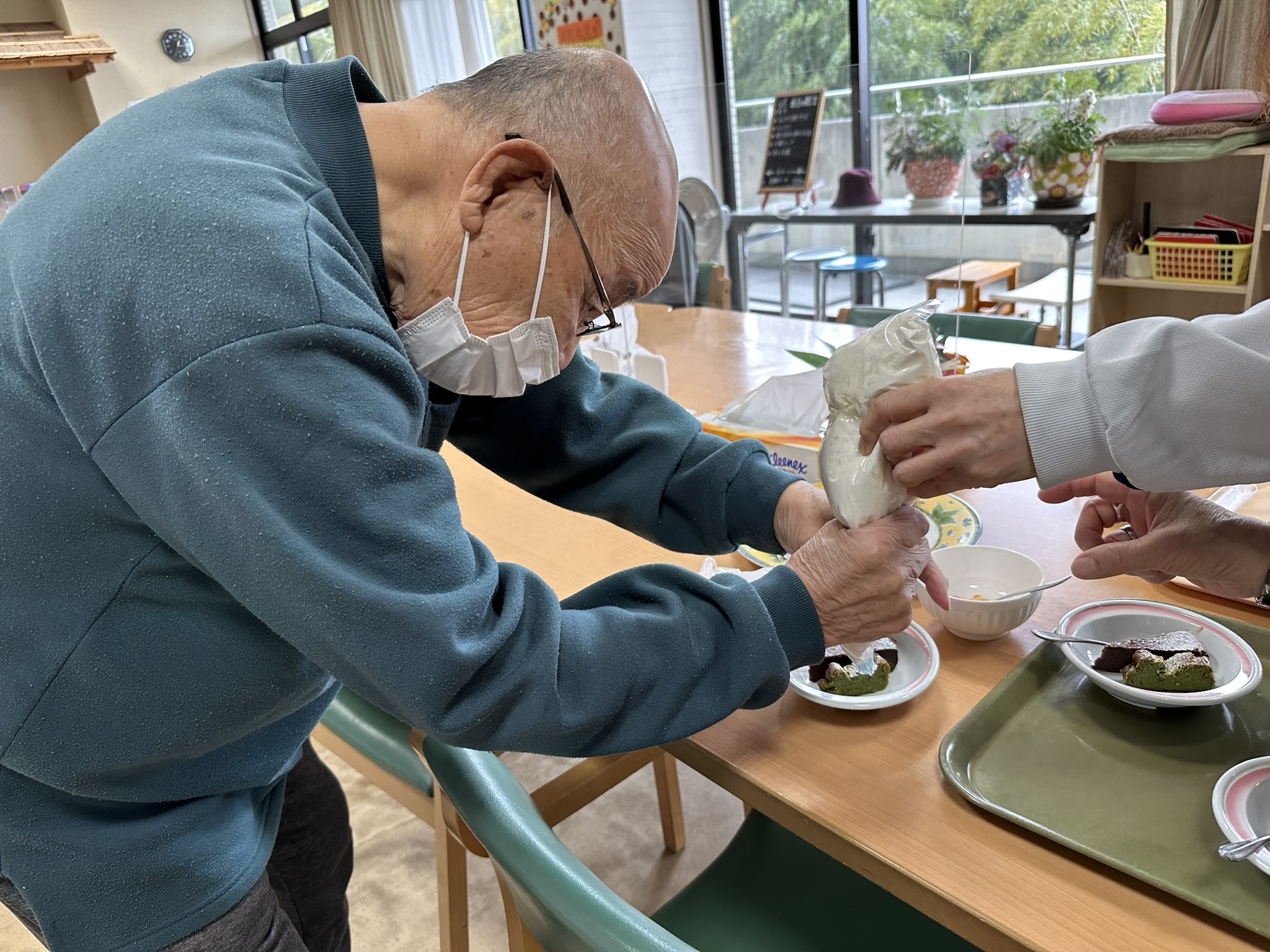 チョコと抹茶の2種類のガトーショコラを作り、デイご利用者様にデコレーションしていただきました。