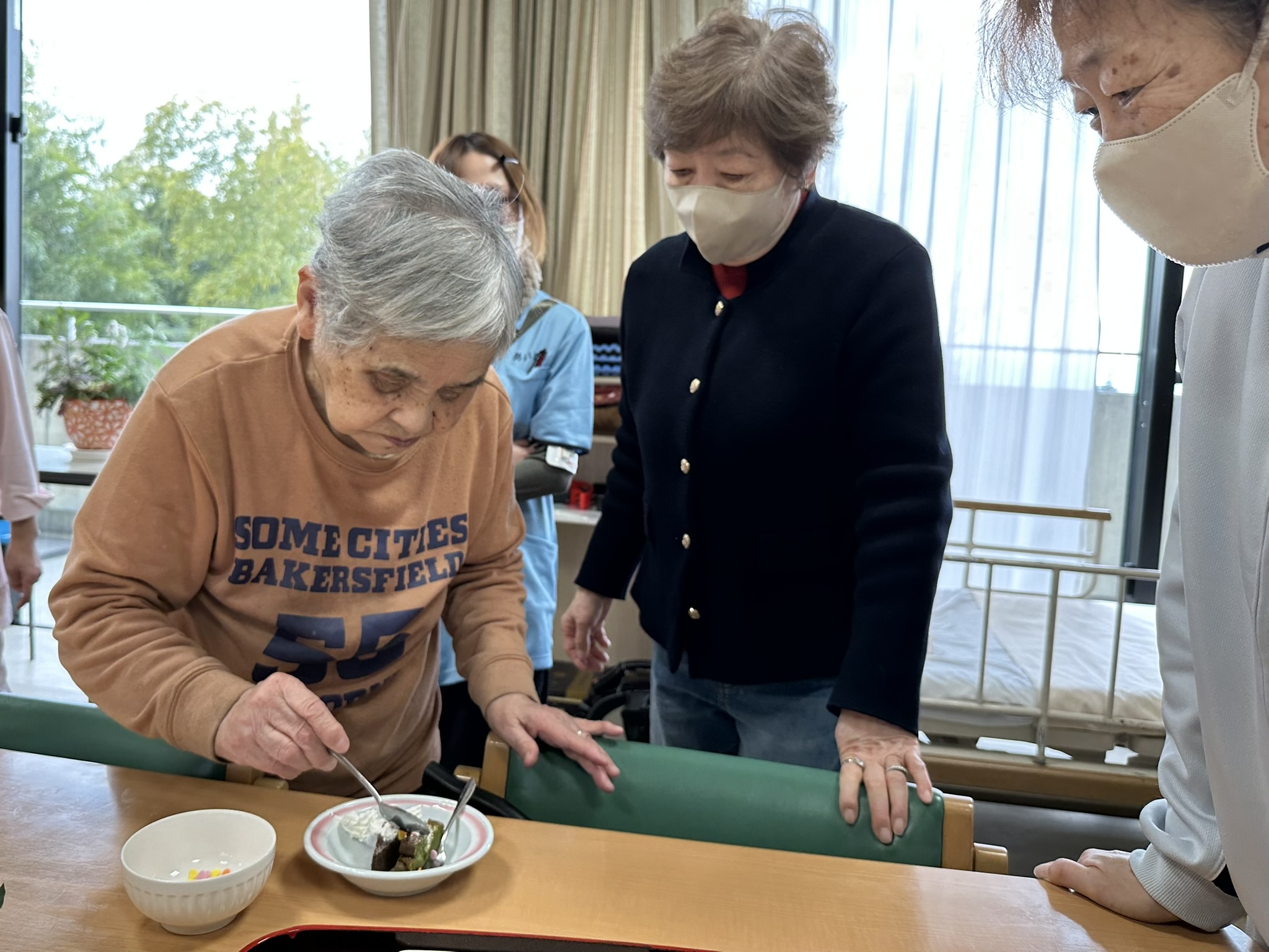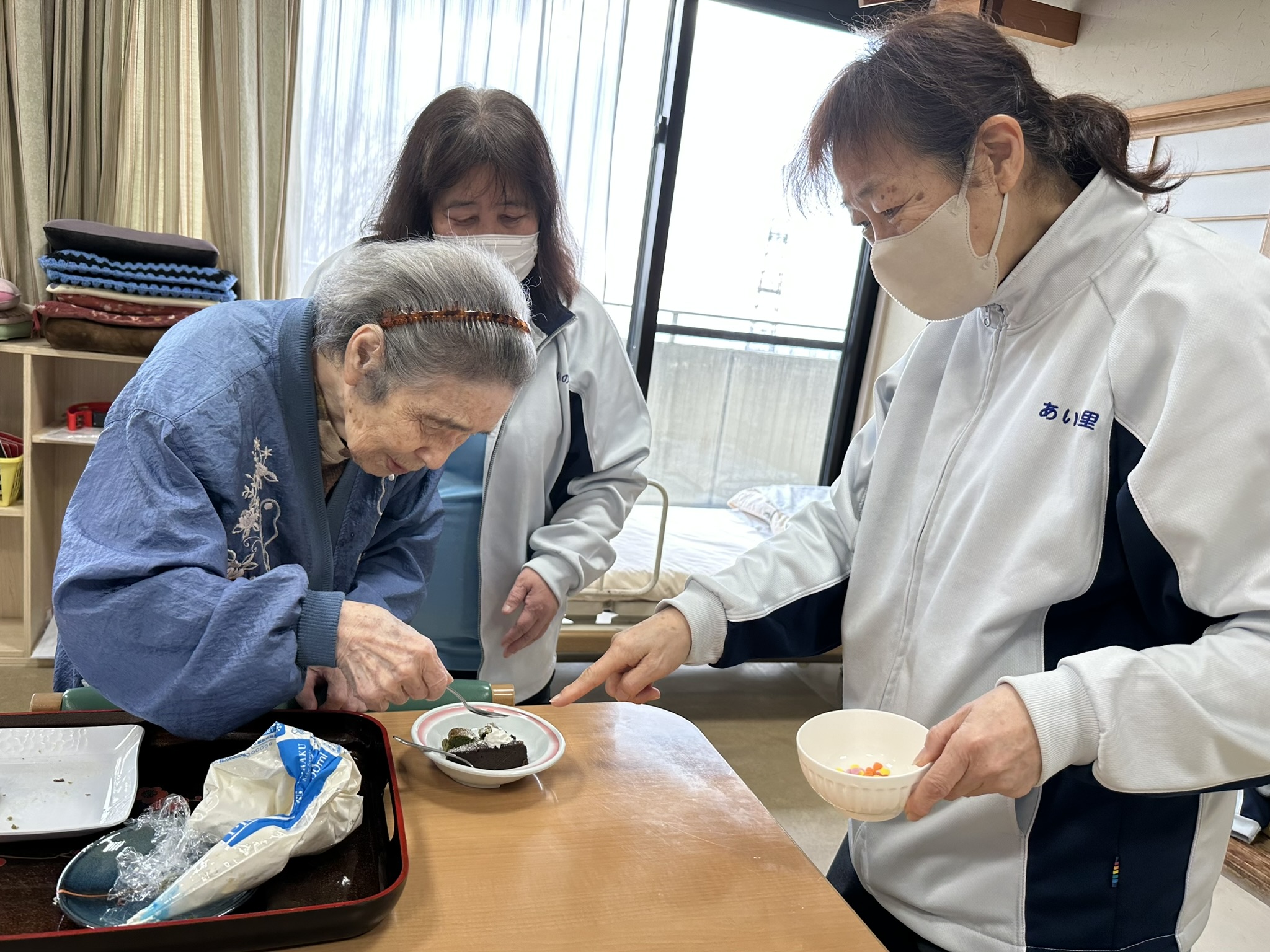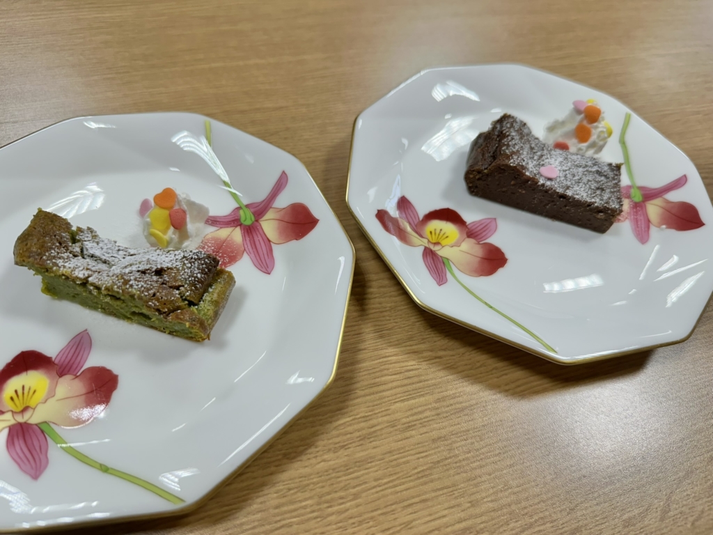 ケアハウスでもガトーショコラを提供させていただきましたよ。女性陣には抹茶が人気でした。