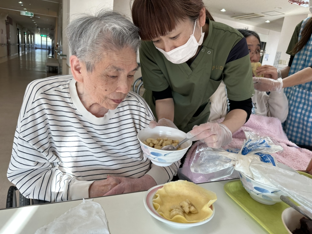 事前に栄養士が生地をひたすら焼き、普段おやつはミキサー食を食べられている方の分もしっかり生地から手作りしました。