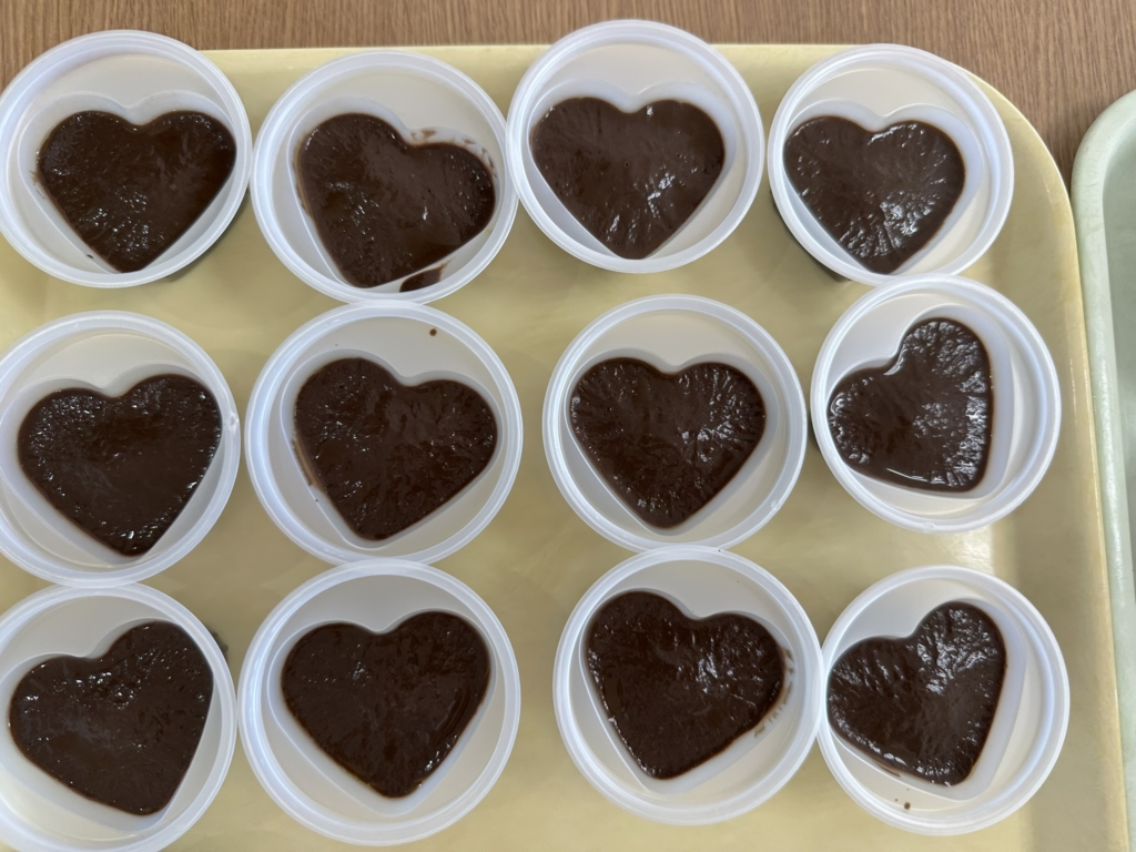 ミキサー食はハート型のチョコプリンでした。
